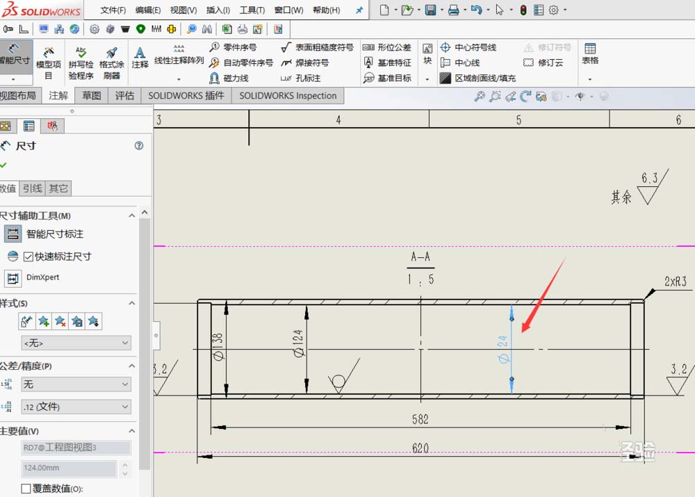 1、我们先进入Solidworks的工程图里面,然后选择注解下来的智能尺寸。