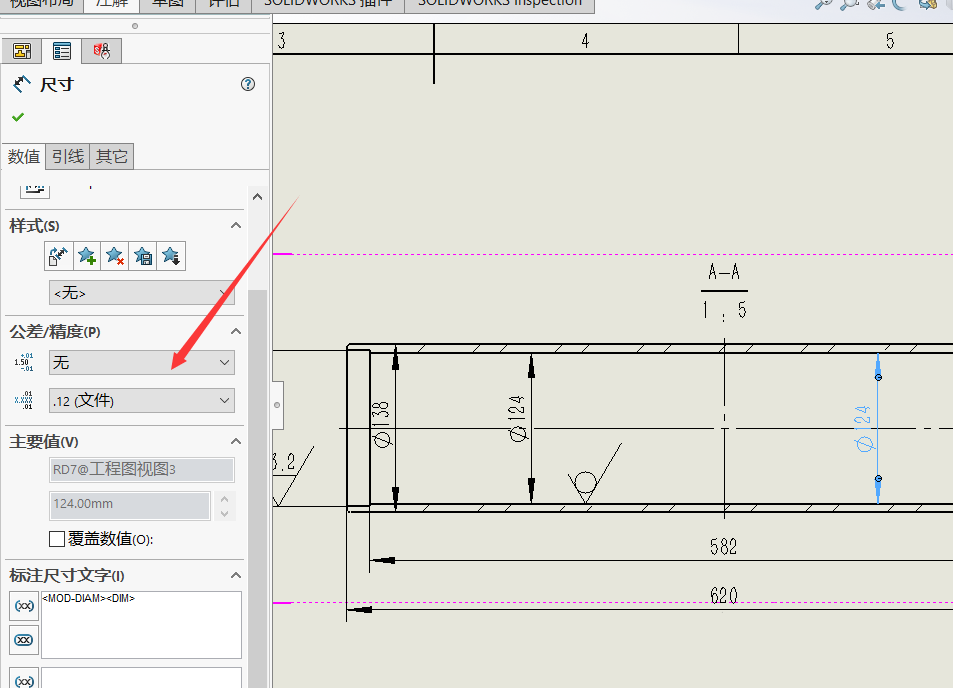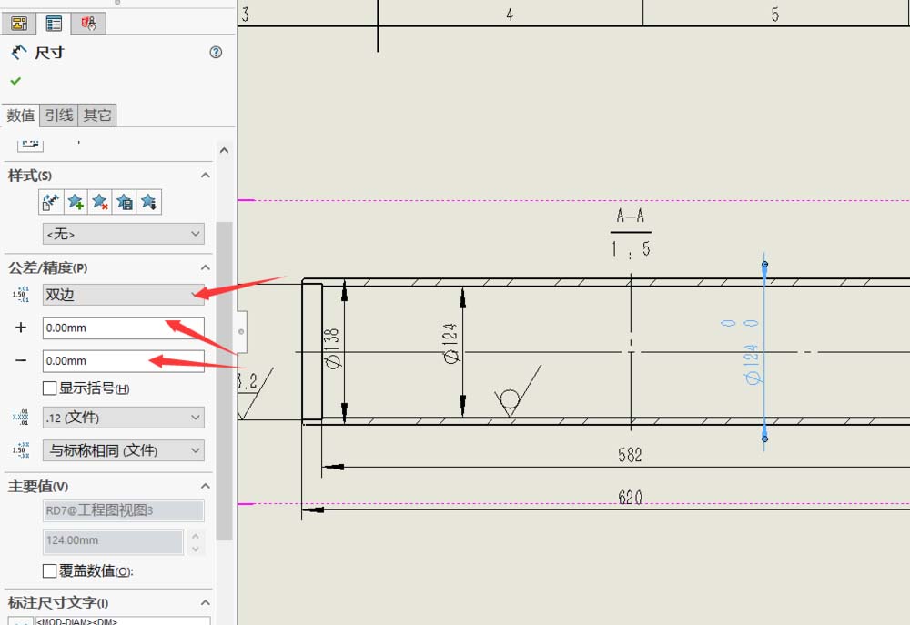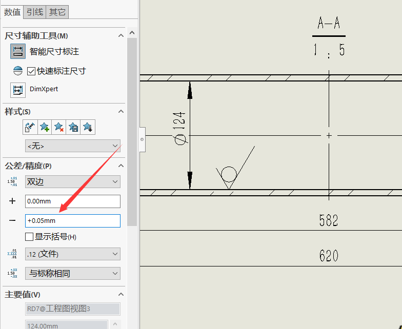 5、然后在这边可以看到两个公差栏,上面一栏有个+号,下面一栏有个减号。