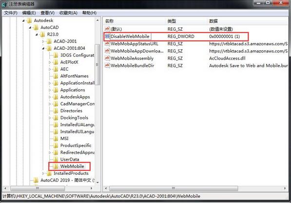 2.定位到 [HKEY_LOCAL_MACHINE\SOFTWARE\Autodesk\AutoCAD\R23.0\ACAD-2001:804\WebMobile] 的位置