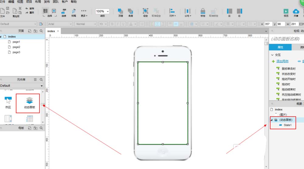 1、我们先打开我们的axure软件,点击新建,然后将我们的手机模型拖拽进我们的axure,点击我们的“动态面板”将其往编辑窗口拖拽。如下图