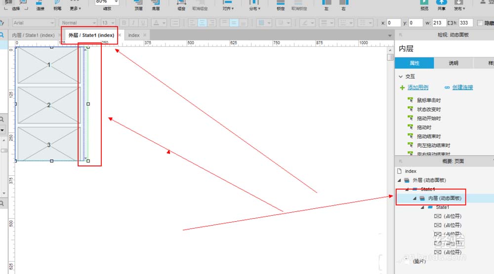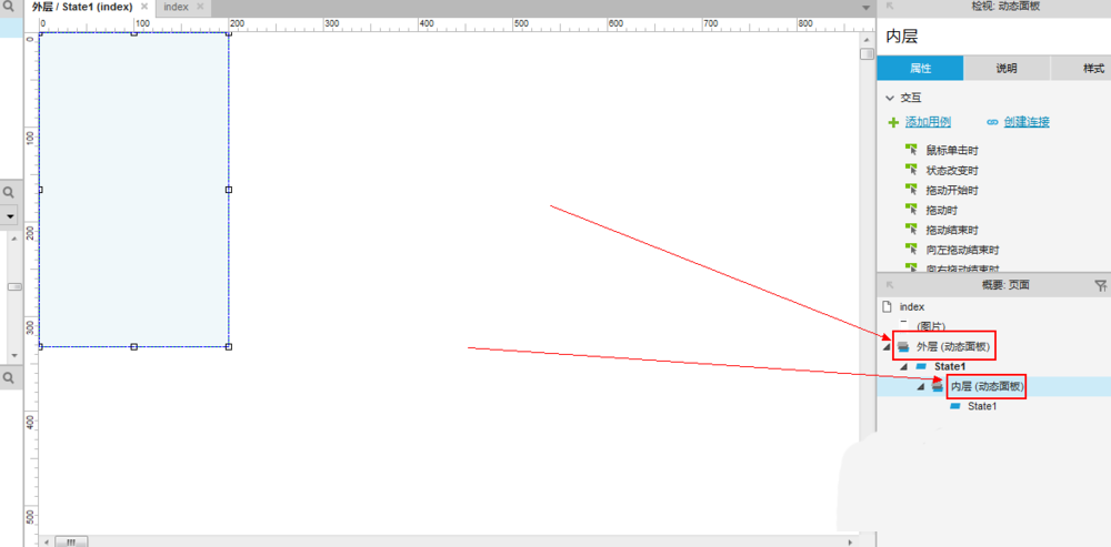2、创建好我们的动态面板之后,按住“ctrl+c”将其复制下来,然后双击我们的“外层动态面板”下面的state1,然后按住“ctrl+v”将我们的“外层动态面板”复制下来