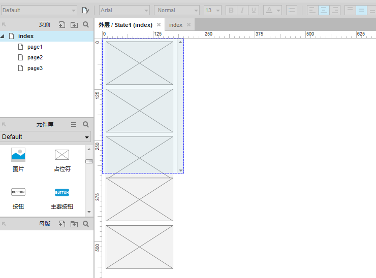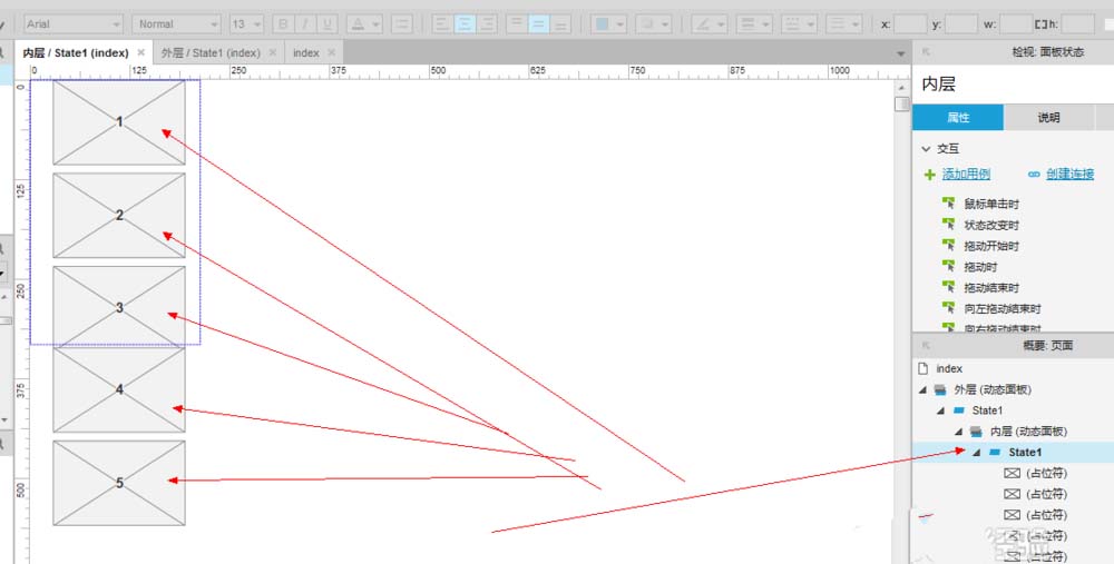 5、由于我们要体现的是一种滚动状态,所以我们的内容必须要长于我们的动态面板所显示的范围,所以我们需要多次添加内容,我们边按住“ctrl”边拖动我们刚才建立的“占位符”,即可复制。如下图。