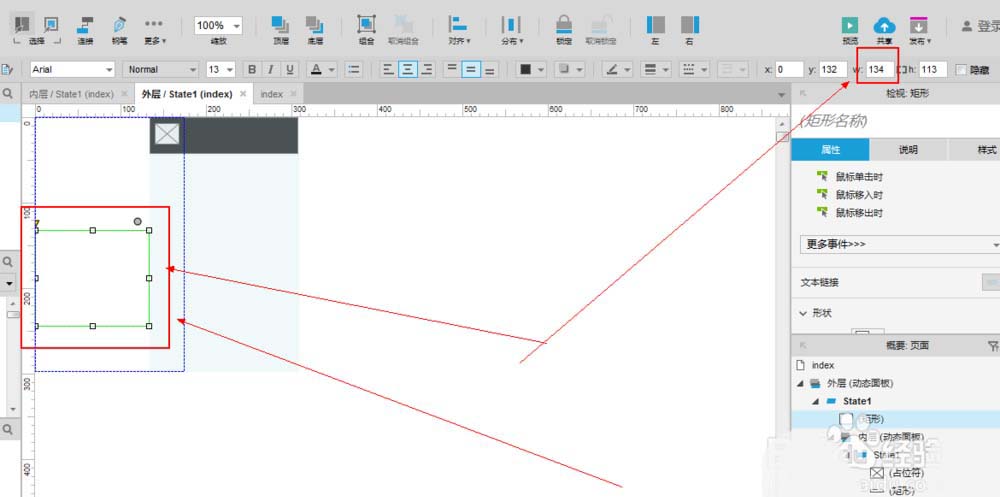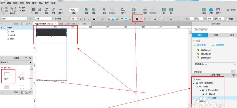 3、然后双击我们的“内层动态面板”下面的state1,然后点击“矩形”,并将其图案拖拽到我们的内层动态面板中,调整好位置,并给其填充颜色。