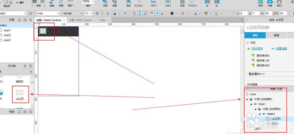 7、点击我们导航栏的“内层”,然后在我们选中我们刚才的“占位符”,然后点击我们的“鼠标单击时”选项,如下图。