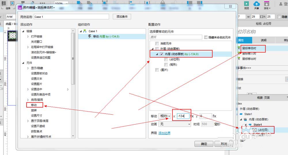 8、进入我们的“单击鼠标时”之后,点击“移动”,勾选“内层”,然后在下面的“y”内输入我们刚才量出来的距离,即“-134”