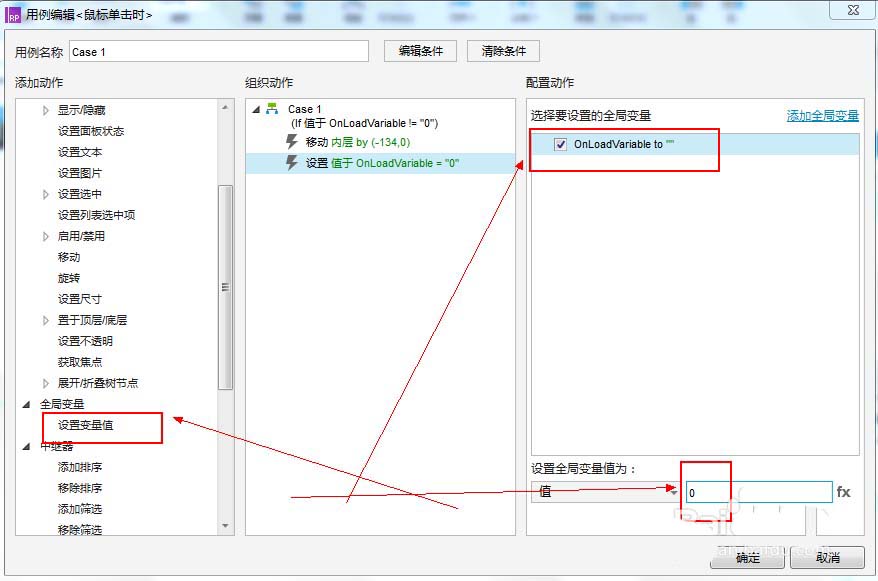 11、然后再次点击我们的“case1”,找到并点击下面的“设置变量值”,勾选“变量”,然后将变量值设为“0”,点击确定,“case2”我们也重复此动作,只是在设置变量值时,不设为0即可。