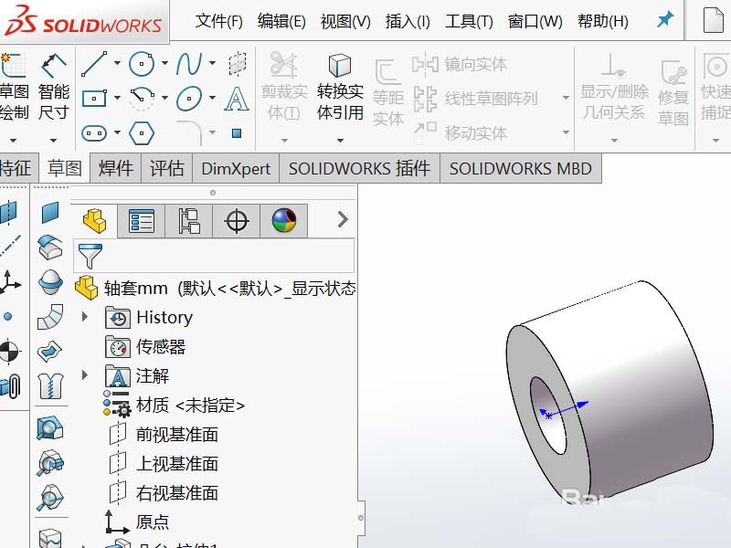 2、打开轴套零件,是不是很熟悉这个画面,在这小编告诉大家我是使用的Solidworks2016版本。