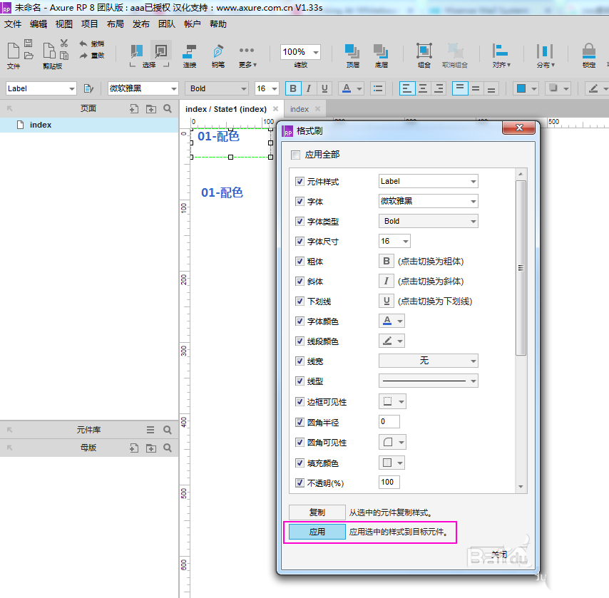 8、再点击需要调整样式的元件,点击“应用”,此时已经完成了样式的调整,但通过效果图可以看出,原来的灰色底色不存在了。