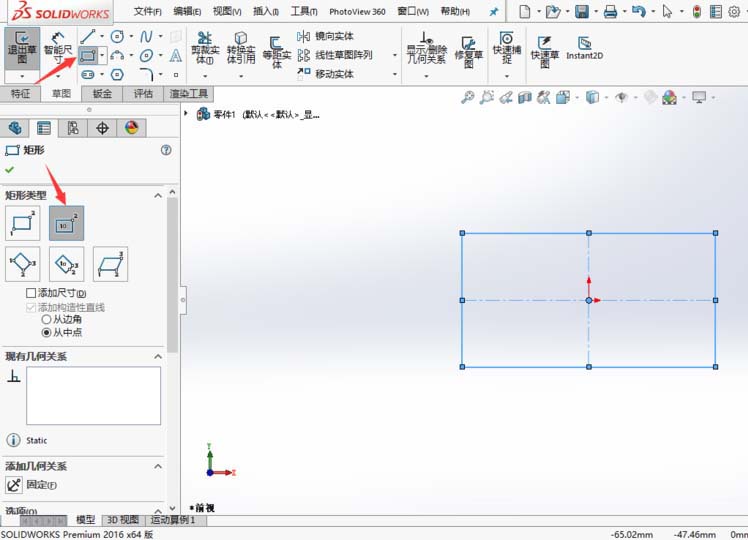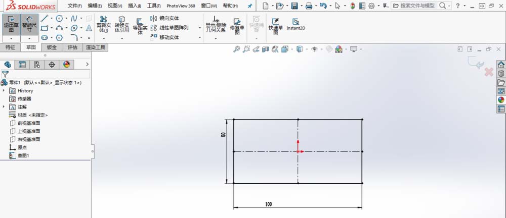 2、我们先在前视基准面创建一个草图,然后绘制一个以原点为中心的矩形并其进行定义。如图所示