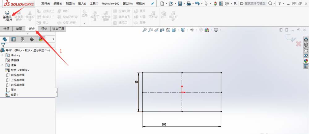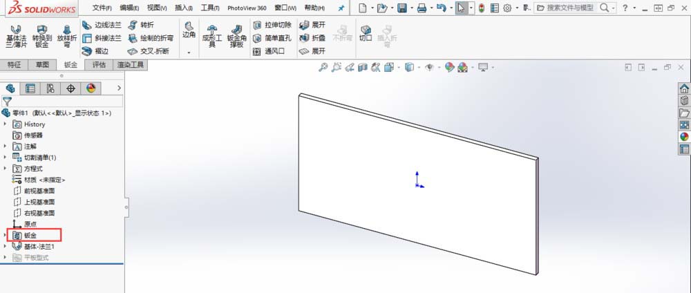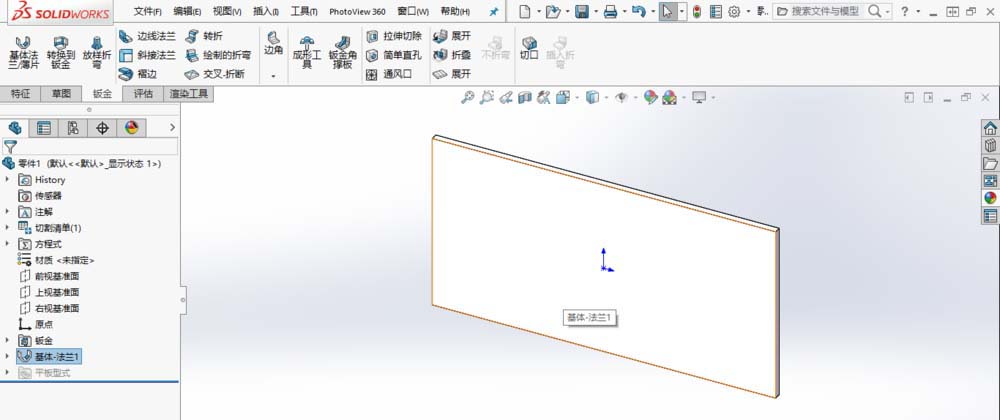 3、然后点击钣金菜单栏里面的基体法兰,然后就绘制完了最基本的钣金