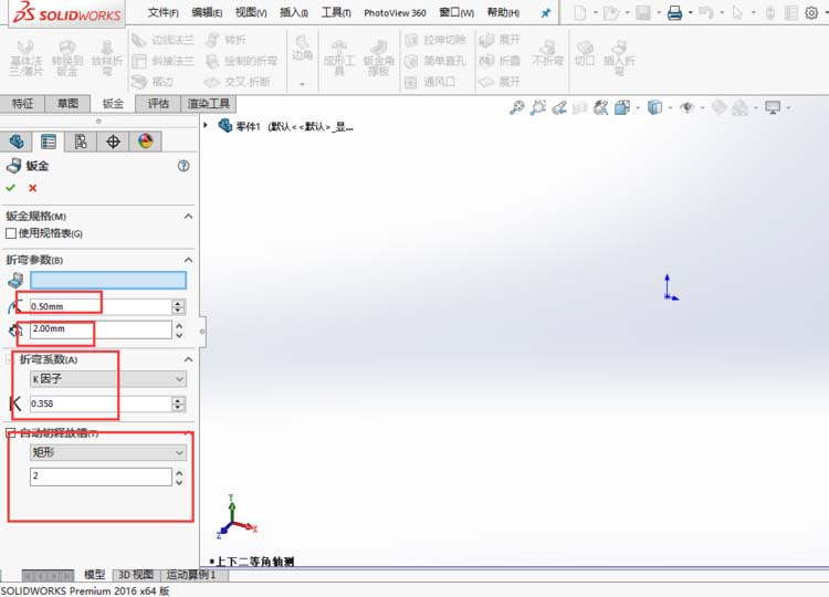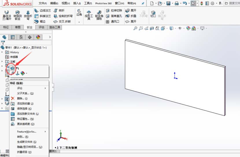 4、然后左侧设计树里面多了一个钣金,然后右键单击钣金编辑特征就可以编辑钣金的参数了,比如钣金的折弯半径、板厚、折弯系数和自动切释放槽等钣金参数了