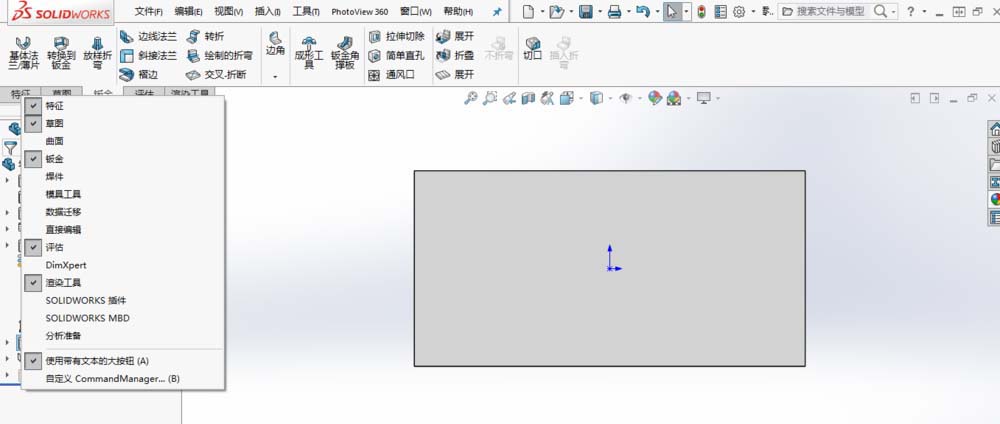 5、如果SolidWorks还没有钣金菜单栏的请调出钣金菜单栏,步骤如下。首先右键单击红框中的任意一个菜单,然后在钣金前面勾选就可以调出钣金菜单栏