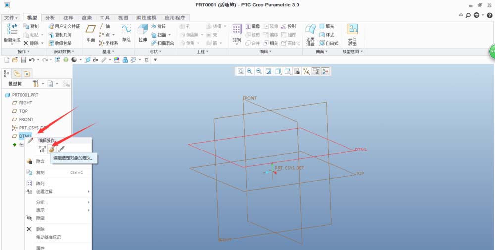 5、如果要更改新建的基准平面的位置,可以在左边的模型树中点击基准平面,右键选择编辑定义。