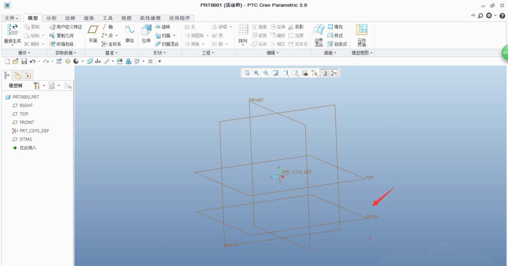 7、点击确定,即可得到新的参考基准平面。新的基准平面在TOP平面的下方。
