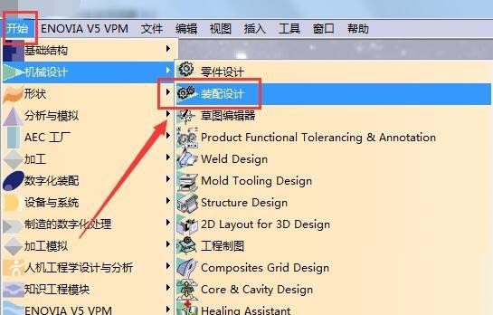 1、打开建模软件,在菜单栏,点击开始,如下图,最终找到装配设计,点击即可启动此模块,进行模型设计。这里启动此模块,只是为了找到零件库。