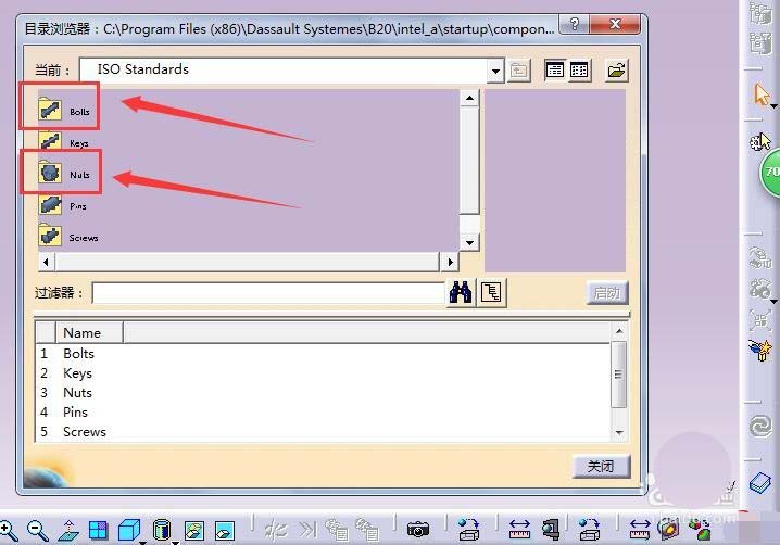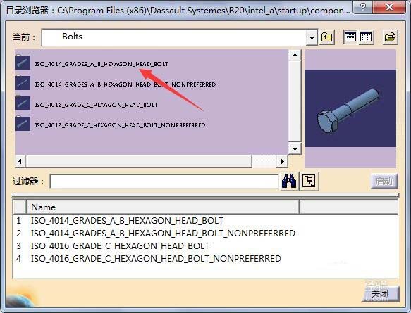 4、此时又会按照不同保准类型,分类螺栓,其螺纹及样式会不同,如果没有自己所需标准,找个最类似的,右侧可浏览样式。注意下方文字和箭头处文字,虽然完全一致,如果想选择某一项,需在上方双击,如双击箭头处。