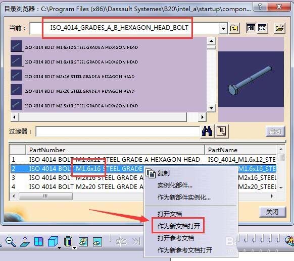 5、接着会显示这一标准下的所有已有数模,需要根据螺纹大径,进行查找,如这里找了M1.6,长度为16mm,可能不是自己需要的。不要紧,后期进行修改,在下方文字处,右击,选择新文档打开。