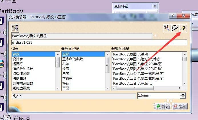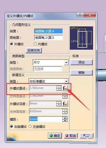 7、会弹出下图设置,比如要修改外径,但发现其为灰色,为不可修改状态,点击箭头指的fx,会弹出图2对话框,点击橡皮擦,清除函数(软件内置一系列模型,通过函数快速生成)后,点确定,该项即可编辑。