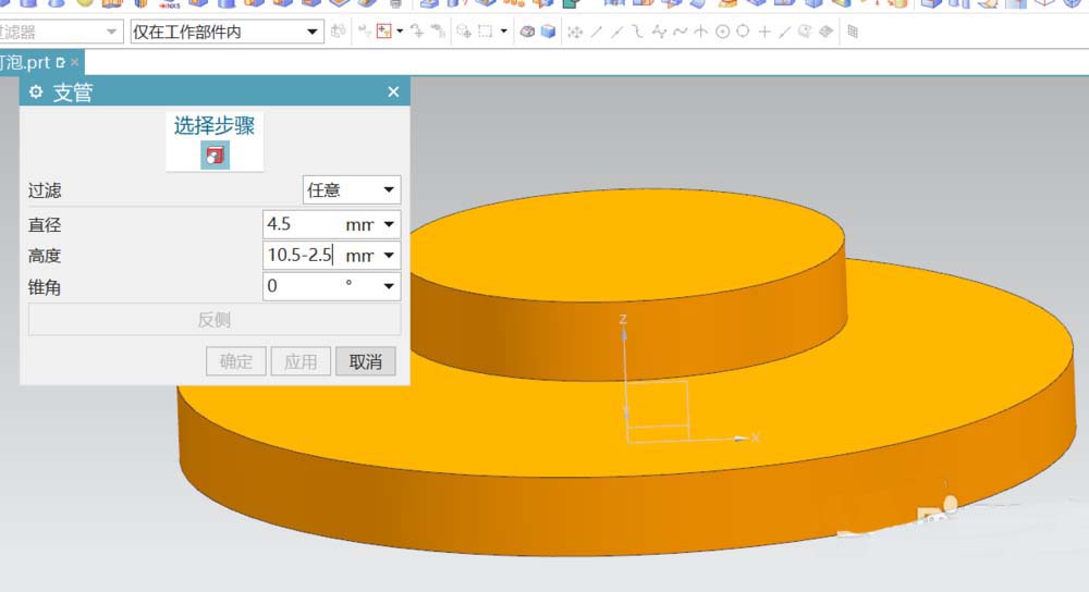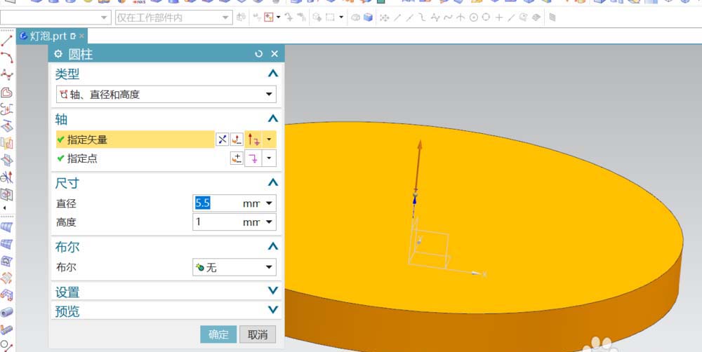 1、灯泡部分的结构基本由圆柱体构成。先创建出与灯泡焊接在一起的电路板部分。直接在建模区中选用圆柱,参数如图所示。