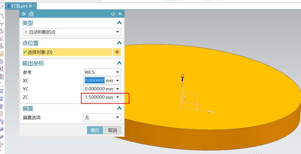 2、在电路板上创建灯泡,先创建灯泡底部的台阶,也是圆柱体,参数如图所示。圆柱的定位Z轴1.5。