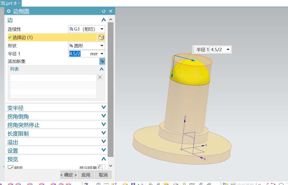 3、在台阶上添加凸台,参数如图所示;将凸台顶端的边倒圆角,半径为2.15.得到发光二极管的外部。