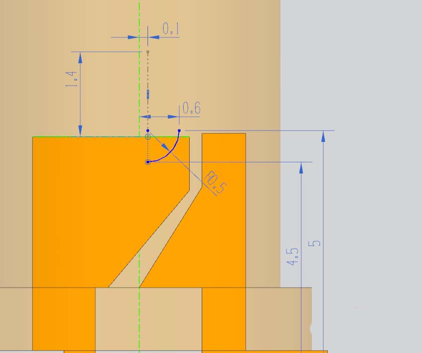 5、选用旋转命令,在YZ面上绘出其旋转线;草图如图所示。旋转出的实体与相应实体合并。在合并得到的实体上,以圆心为定点,创建一直径为0.8的圆球,与之进行布尔求差。得到完整的模型。