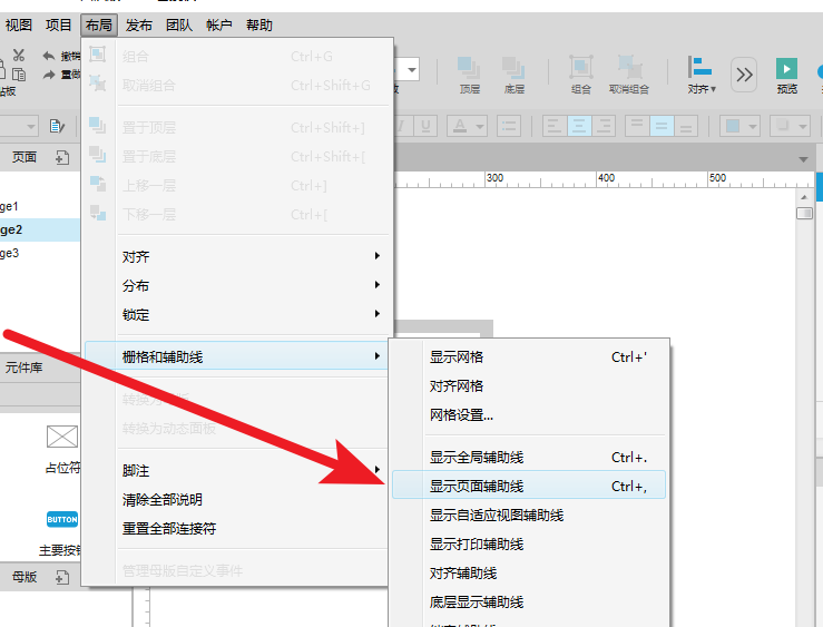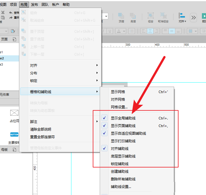 5、按照拉取页面辅助线的步骤,按住Ctrl键,可以创建全局辅助线;