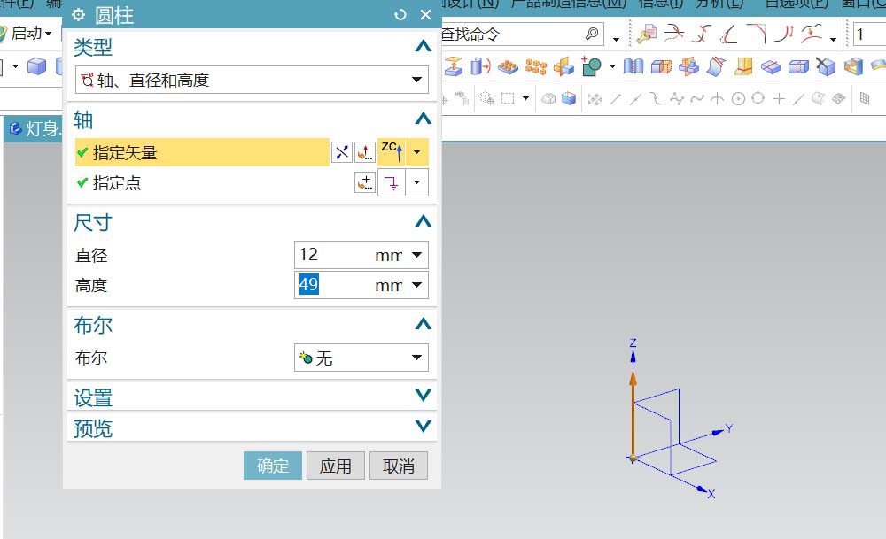 1、主体为圆柱体,直接在建模区中选用圆柱,参数如图所示。