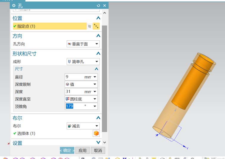 3、选用孔命令,在圆柱顶端以圆心为定位点,开一直径为9深度为31的平头孔。