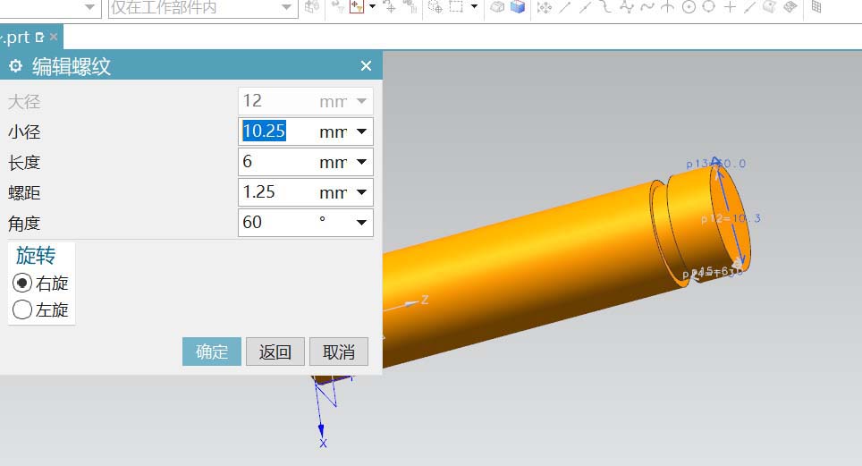 4、在如图所示的位置,创建了一条螺纹;参数如图。