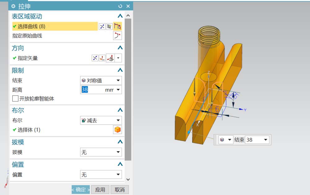 5、选用拉伸命令,以yz面为草绘面,如图绘出拉伸的截面线;完成后对拉伸进行布尔求差,得到如图所示的造型。