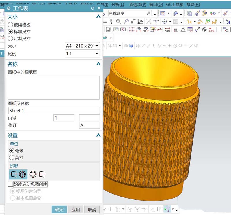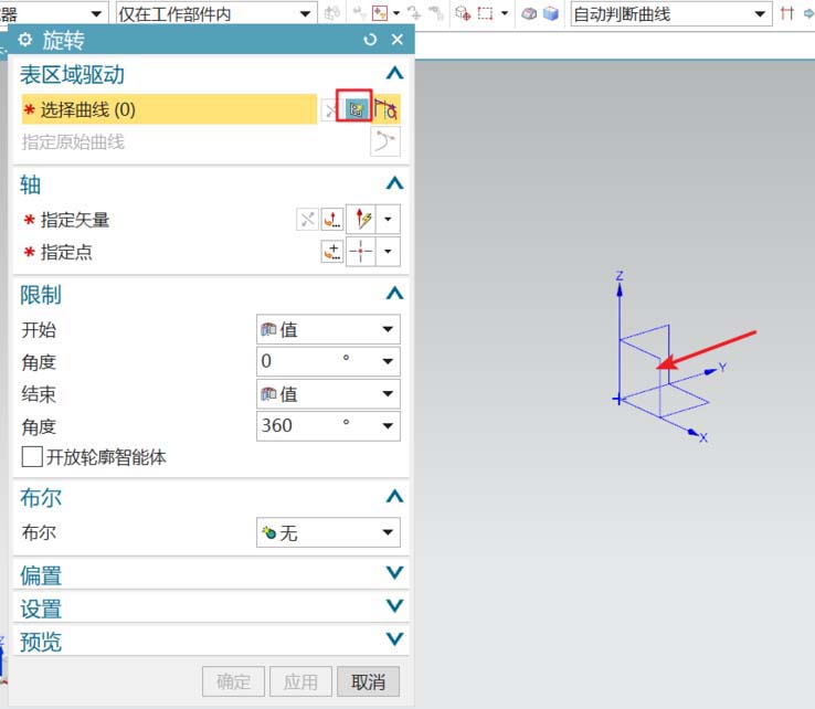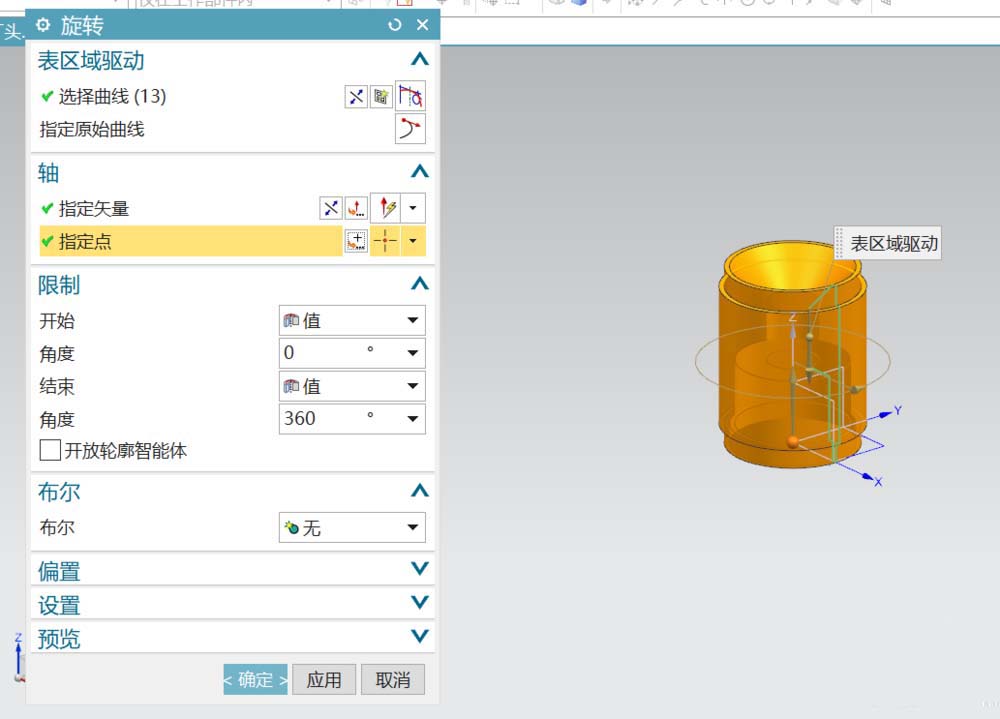 2、回到建模工作区,在旋转的对话框中,设定相关参数得到灯头的基本实体。