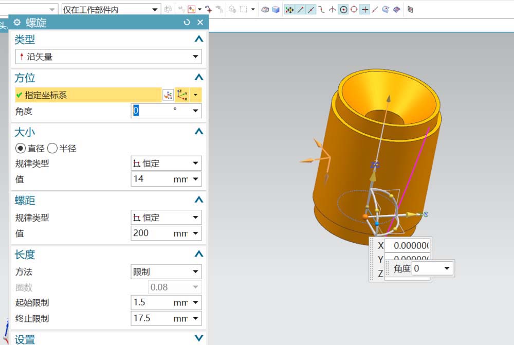 3、选用螺旋线,调整其参数,得到一条附于灯头实体的曲线,作为引导线。具体参数如图所示。