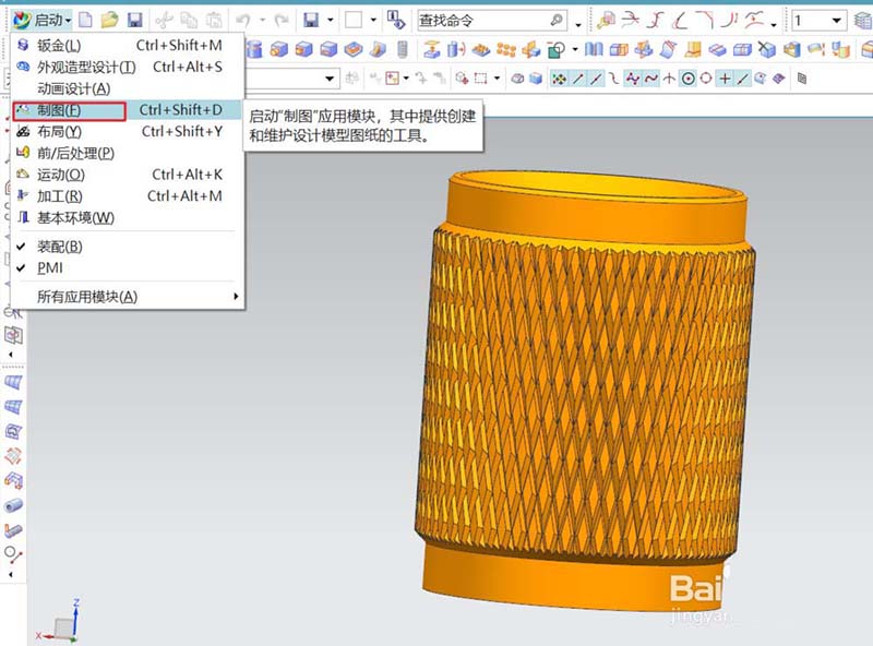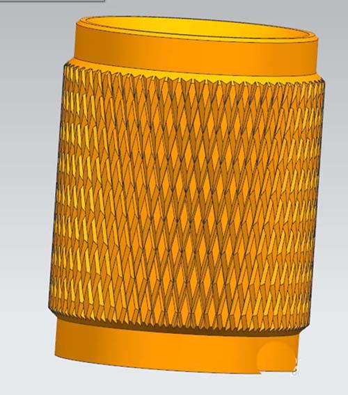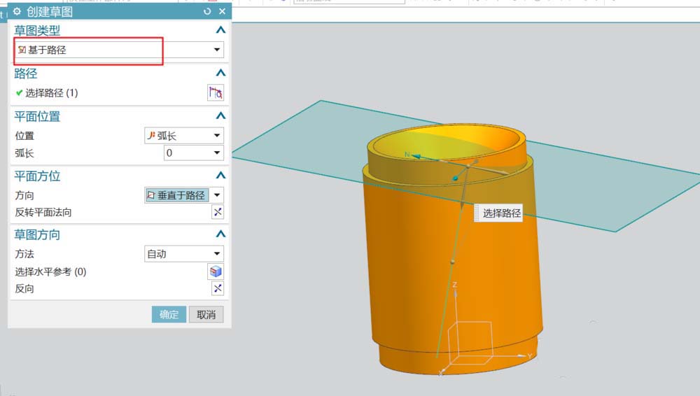 4、选在任务环境中绘草图,类型为基于路径,平面方位为垂直于路径。在草图平面里绘出引导的截面线。用扫掠命令和布尔求差得到单条滚花。通过镜像特征和阵列特征得到滚花效果。