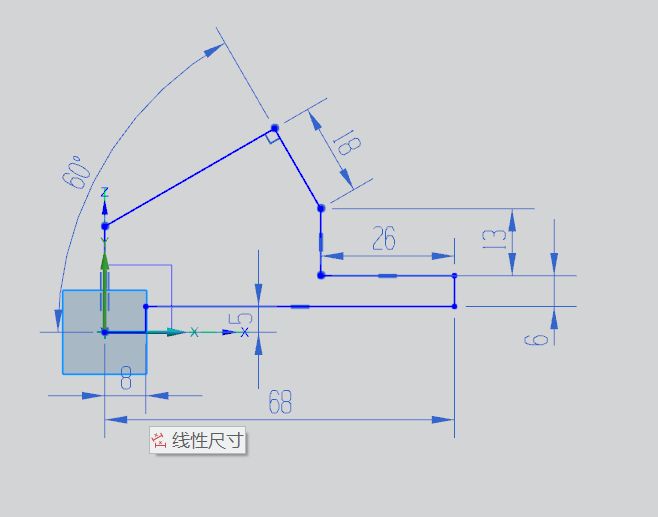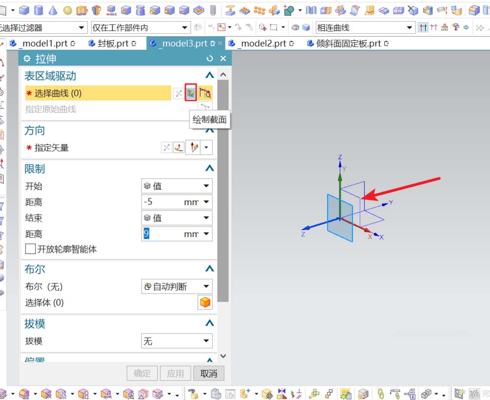 1、新建建模文件,该零件的主体可直接通过拉伸得到;选用拉伸,以XZ面为草图平面进行截面线的绘制。