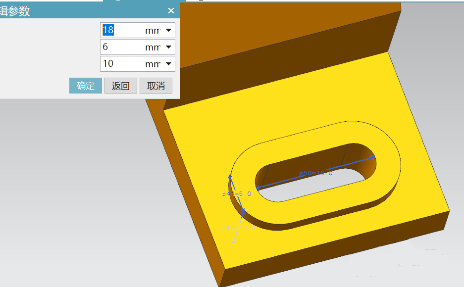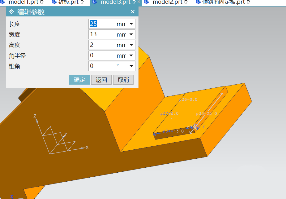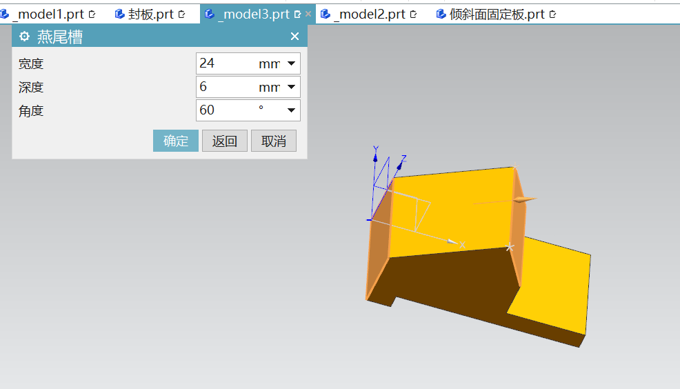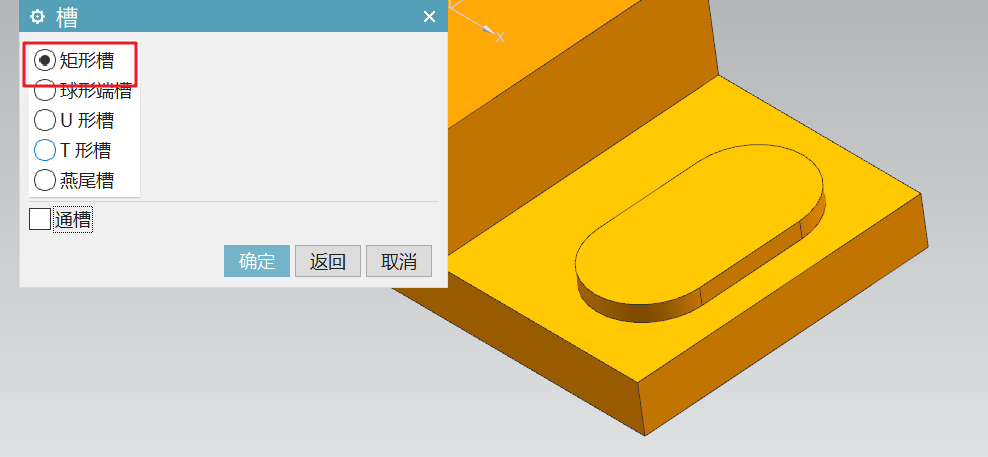 4选用键槽命令,选用”燕尾槽“并激活”通槽“;具体参数如图所示,得到一个在该斜面的中间开出的燕尾槽。