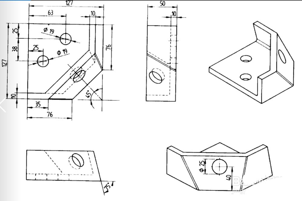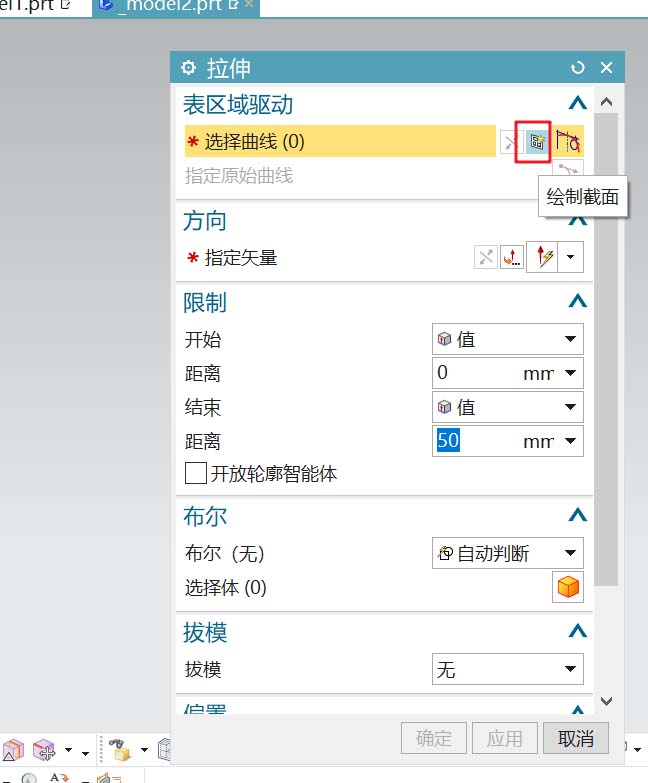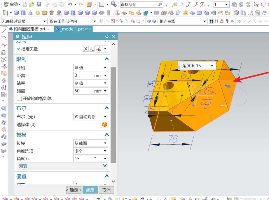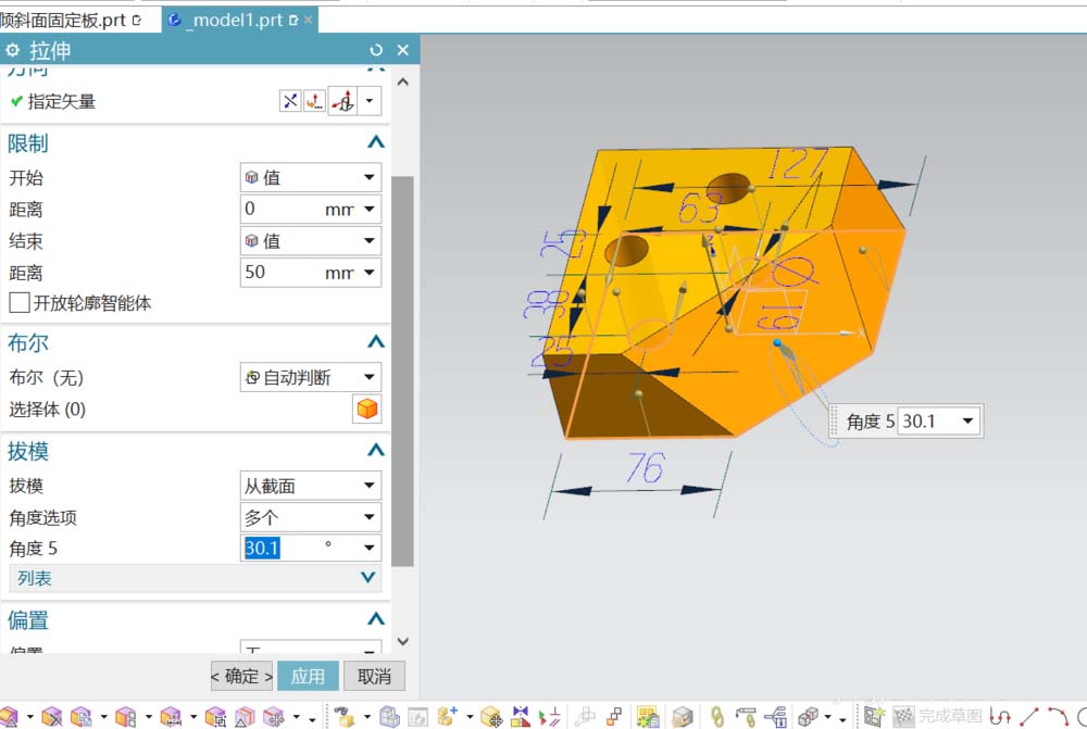 截面线绘完后,进入拉伸对话框;拉伸距离为50,激活拔模选项,选择“从截在面“;角度选项为”多个“;根据图纸所给数据,得知有两个面是倾斜的;角度分别是15、30.1度;分别对相应的面设定角度。完成模型的基本结构。