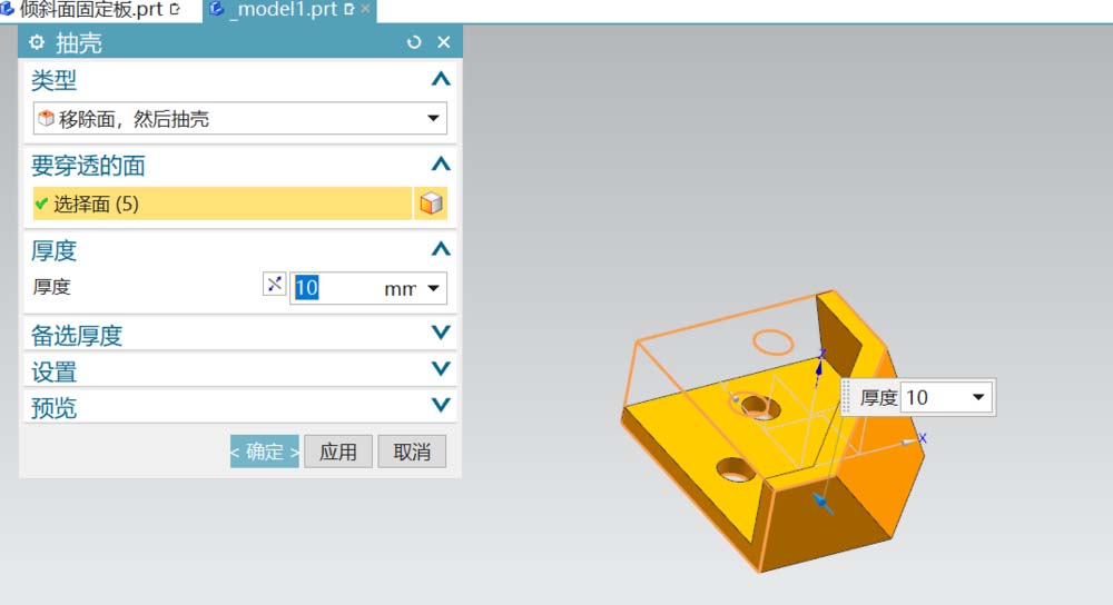 4、选用抽壳命令,厚度为10.如图所示。