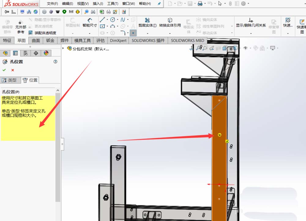 6、然后右键编辑孔的位置,选择智能尺寸定义孔的位置即可。