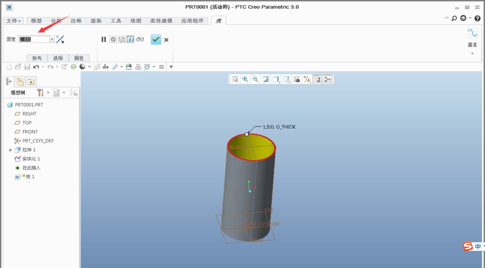 5、然后点击壳功能,选择圆柱体的上表面,输入需要的厚度;