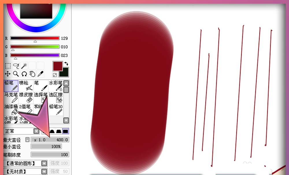 3、笔刷的大小通过最大直径来调节。最大直径较小时,就和我们平时用的笔一样,能画出一根一根的线条。