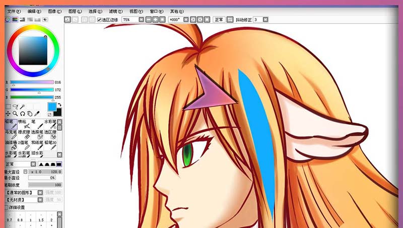 6、接下来是笔刷浓度,笔刷浓度这里举个例子来说明,我现在用百分之百笔刷浓度的铅笔为黄色的头发铺一个蓝色,可以发现,黄色的头发被完全覆盖。