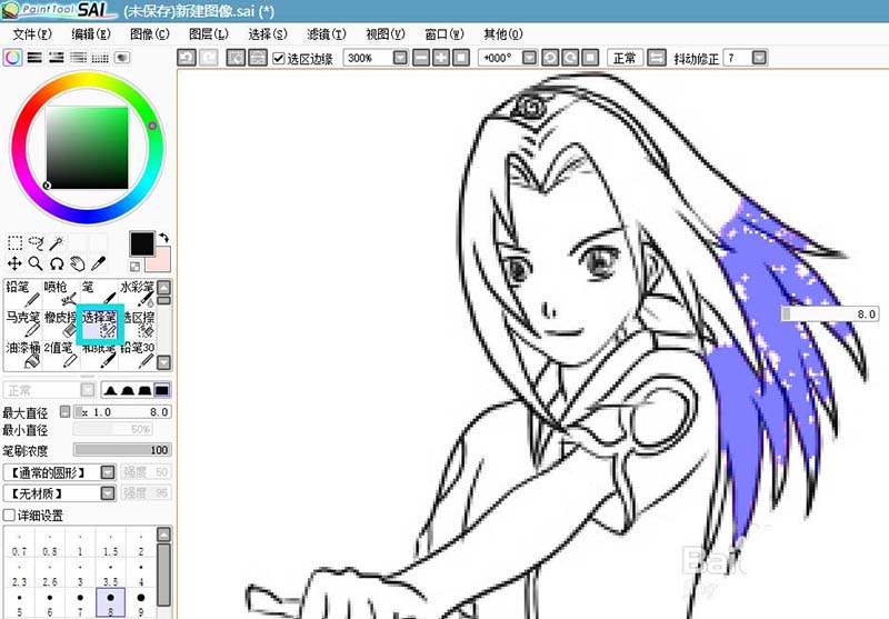 sai人物线稿上色的时候,发现往往发梢部分选择不到,不得不用选择笔涂抹,我们就可以使用魔棒选择工具选择发梢细节的地方,下面我们就来看看详细的教程。
