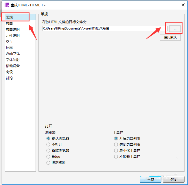 6、选中【常规】-->点击路径后面的【...】按钮,修改【存放HTML文件的目标文件夹】--> 【生成】。
