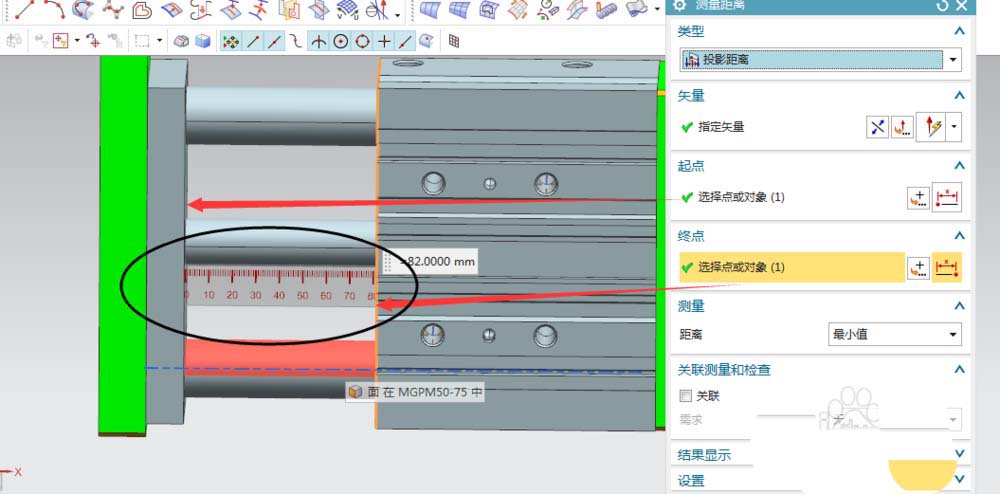 6、选择需要测量的距离边或者面即可。距离就会在小尺子上显示。