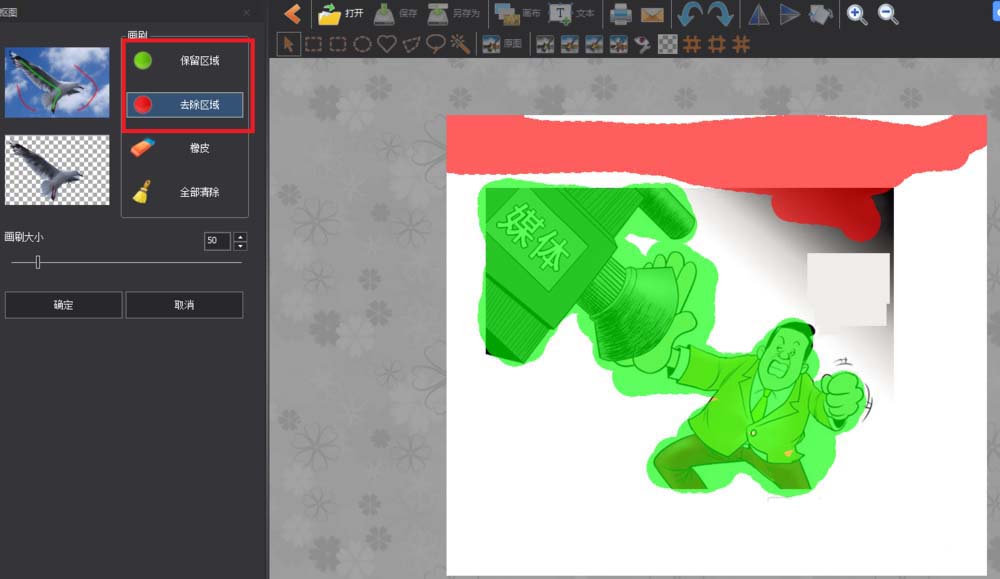 3、点击画刷,选择绿色画刷(保留区域),把要保留的区域全部刷一下,然后选择红色画刷(去除区域)把不要的地方刷一下。设置完成后按确定