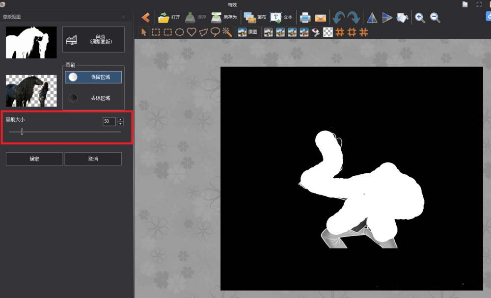 4、也可以点击工具——蒙版抠图,刷白色是保留区域,刷黑色是去除区域,然后点击确定就能扣出形状图了。
