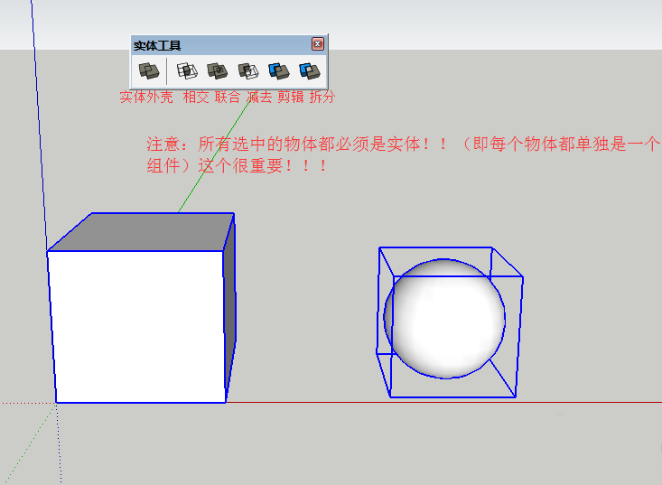 注意:所以选定的物体都必须是实体!!(即每个选择的物体都必须是一个单独的组件)这一点很重要!!!
