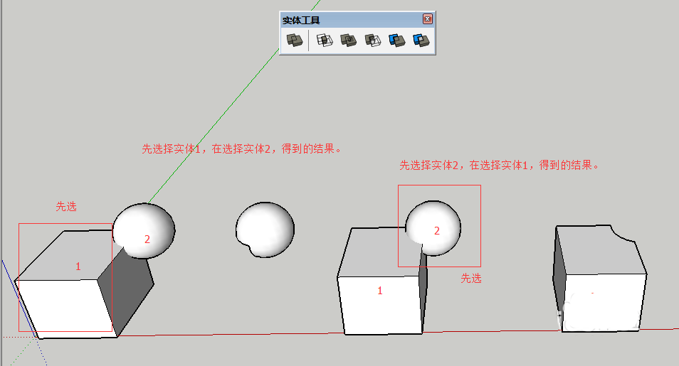 注意:这里操作顺序不同,得到的结果不同。如图,是用后选择的实体减去前选择的实体。