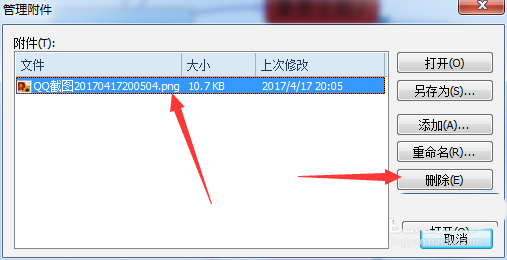 5、进入到了管理附件窗口当中,进行选中要删除的附件,然后点击删除。